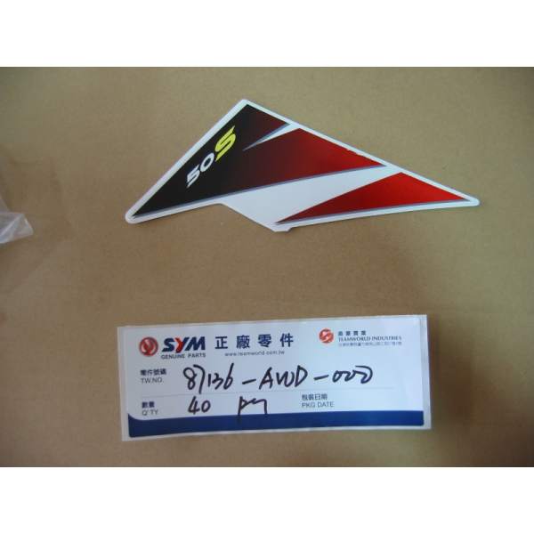 Description The spare adhesif lateral gauche 50s face avant part number 87136-AWD-000 is a genuine SYM part which means it is exactly the same as the one mounted at the factory when the vehicle was new